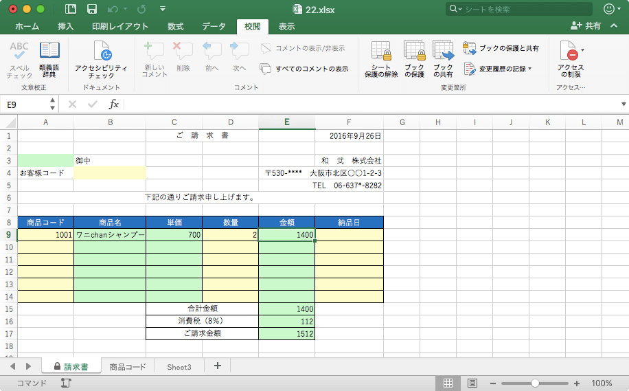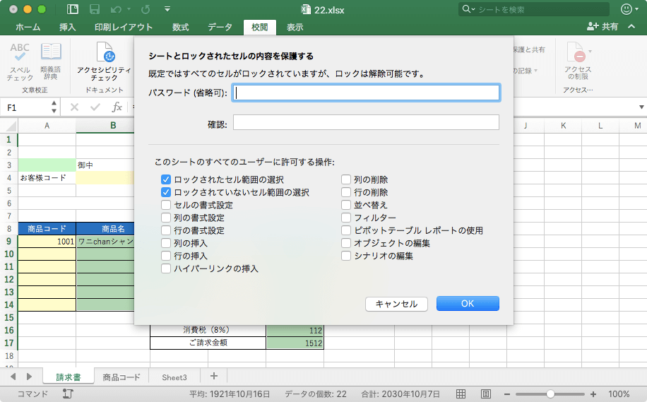 - A1セルを選択して、[校閲]タブを開き、[変更]グループの[シートの保護]を選択します。