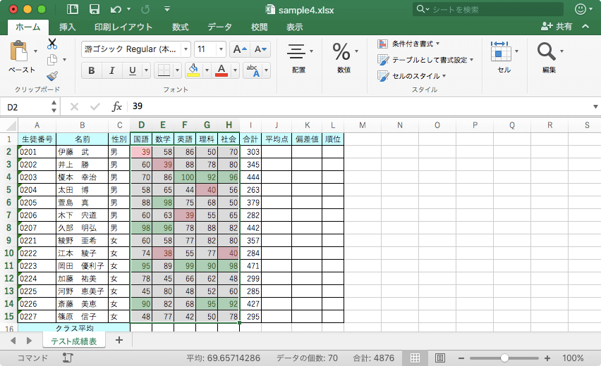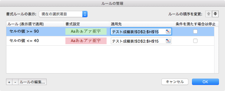 [ルールの管理]ダイアログボックスを使って、条件付き書式の複数のルールを同時に設定できます。たとえば、90以上の場合は濃い緑の文字の緑の背景、40以下の値は濃い赤の文字の明るい赤の背景のように、セル範囲の値に応じて異なる書式を設定できます。Excel 2016 for Macで対象となるセル範囲を選択して[ホーム]タブの[スタイル]グループの[条件付き書式]をクリックし、一覧から[ルールの管理]を選択して、ルールをそれぞれ作成します。