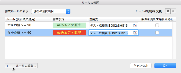 [ルールの管理]ダイアログボックスを使って、既存のルールを削除できます。Excel 2016 for Macで対象となるルールを選択して[-]ボタンをクリックします。ここでは、40以下の場合のルールを削除する方法について説明します。