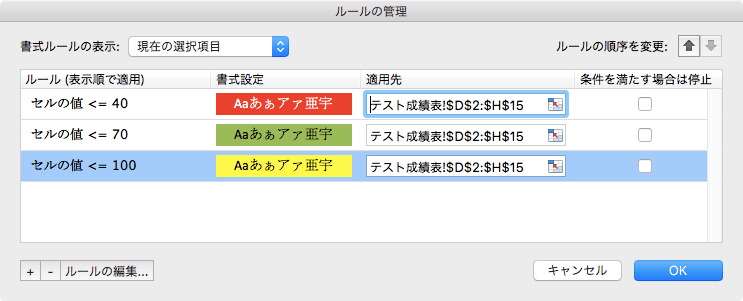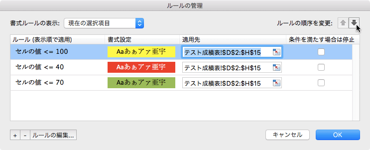 複数のルールが設定されている場合、ルールの優先順位を変更できます。書式が競合している場合、優先順位の高いルールの書式から適用されます。後から設定したルールが一番優先順位が高くなります。Excel 2016 for Macで優先順位を変更するには[ルールの管理]ダイアログボックス右上の[ルールの順序を変更]の上下矢印アイコンボタンを利用します。