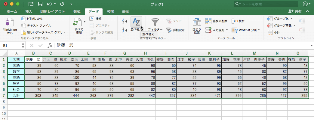 - [データ]メニューの[並べ替え]を選択、もしくは[データ]タブの[並べ替え]をクリックします。