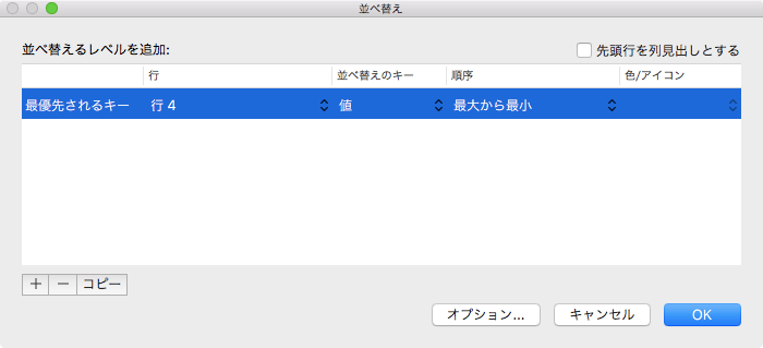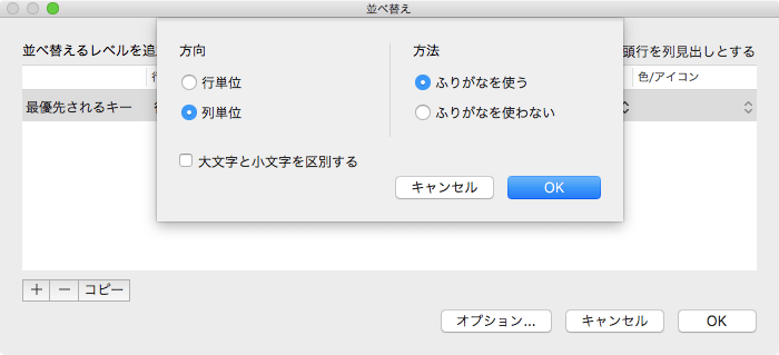 - [並べ替え]ダイアログボックスの[オプション]を選択します。
