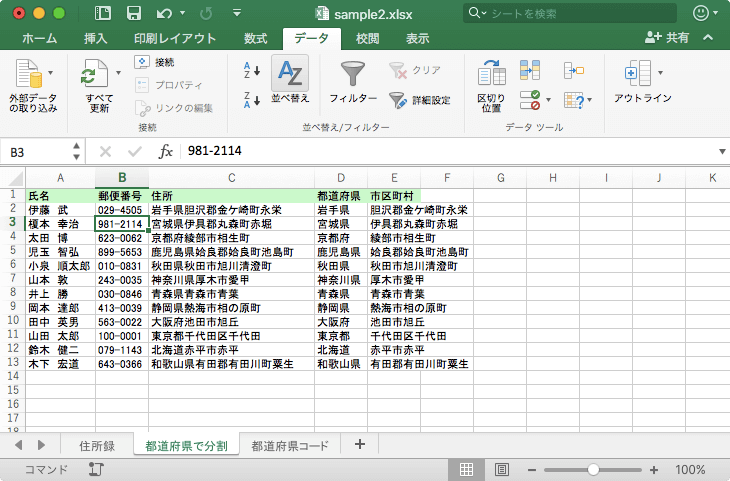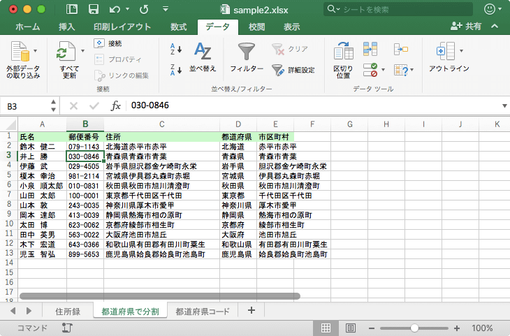 - サンプルファイルの[都道府県で分割]シートを開きます。