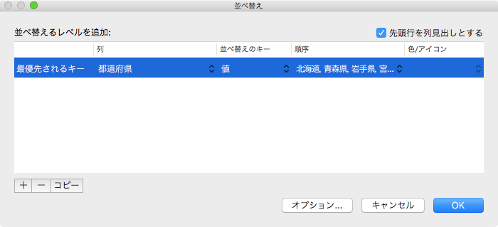 - [並べ替え]ダイアログボックスに戻り、[順序]ボックスに都道府県コード順のリストが表示されていることを確認して[OK]ボタンをクリックします。