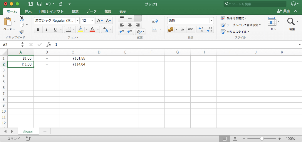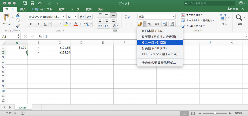 既定では日本円の通貨になりますが、そのほかの通貨の表示形式にするには、Excel 2016 for Macで[ホーム]タブの[数値]グループの[通貨]ボタンの▼をクリックして、一覧から選択します。
