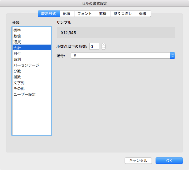 - [セルの書式設定]ダイアログボックスの[分類]の一覧から[会計]を選択します。