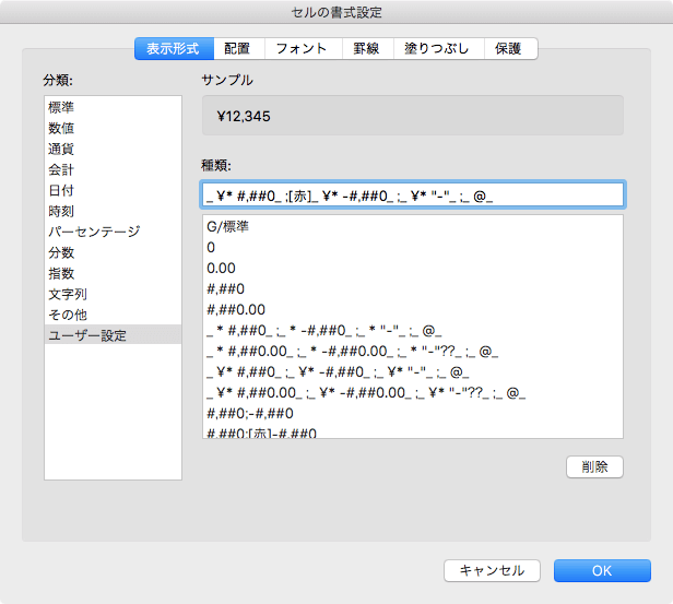 ユーザー定義の表示形式の適用