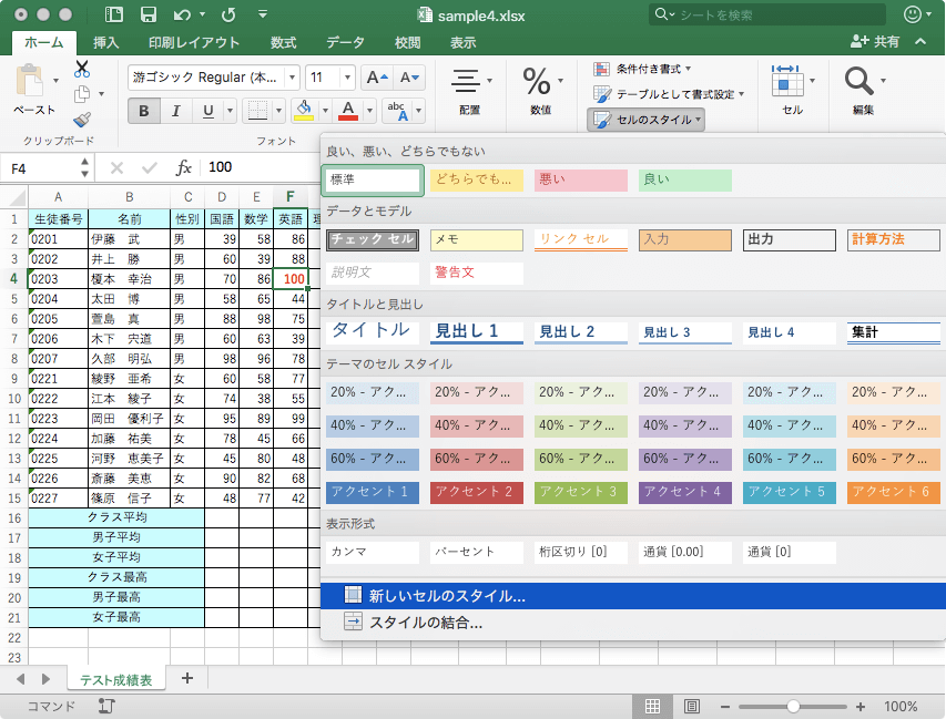 - [ホーム]タブの[スタイル]グループの[セルのスタイル]をクリックして、[新しいセルのスタイル]を選択します。