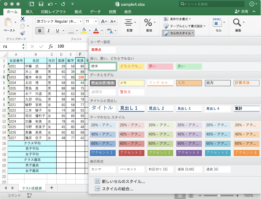 Excel 2016 for Macで対象となるスタイルが適用されたセルを選択し、[ホーム]タブの[スタイル]グループの[セルのスタイル]をクリックして、[新しいセルのスタイル]を選択し、[新規セル スタイル]ダイアログボックスの[スタイル名]に新しいセルの名前を入力して、適用するスタイルプロパティを選択します。