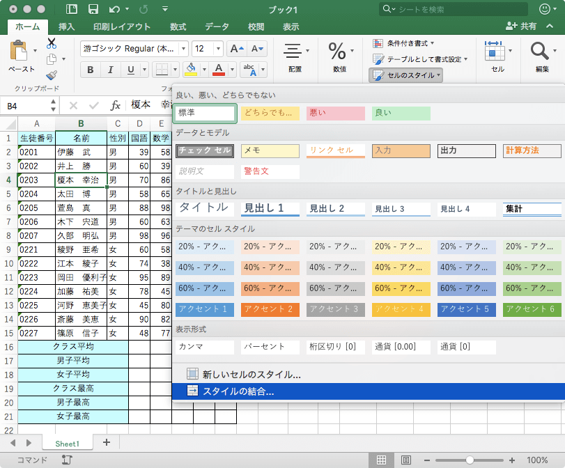 コピー先のブックをアクティブブックにして、[ホーム]タブの[スタイル]グループの[セルのスタイル]をクリックし、[スタイルの結合]を選択します。