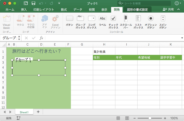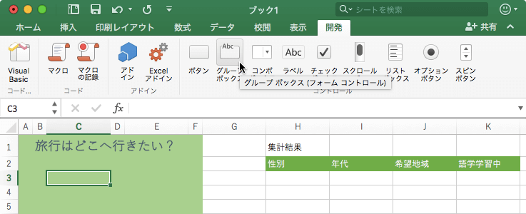 - [開発]タブを開き、[コントロール]グループの[グループボックス]をクリックします。