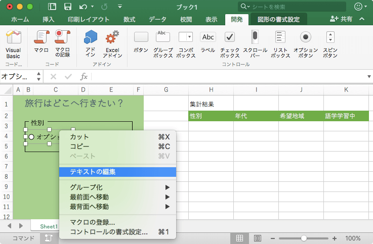 - オプションボタンを右クリックしてショートカットメニューより[テキストの編集]をクリックすると、テキストを編集できます。