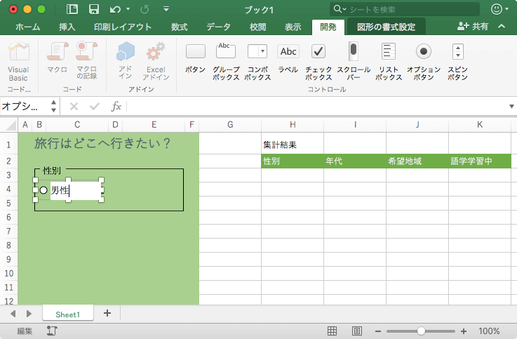 - 同じ要領で「女性」のオプションボタンを挿入します。