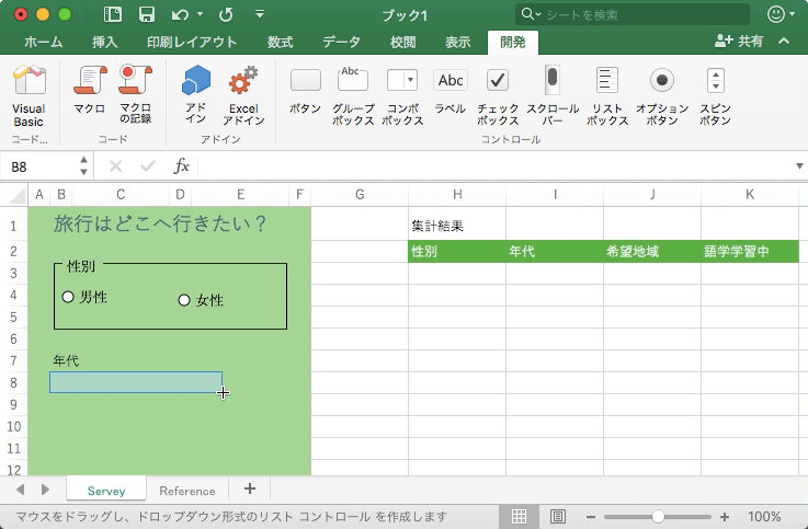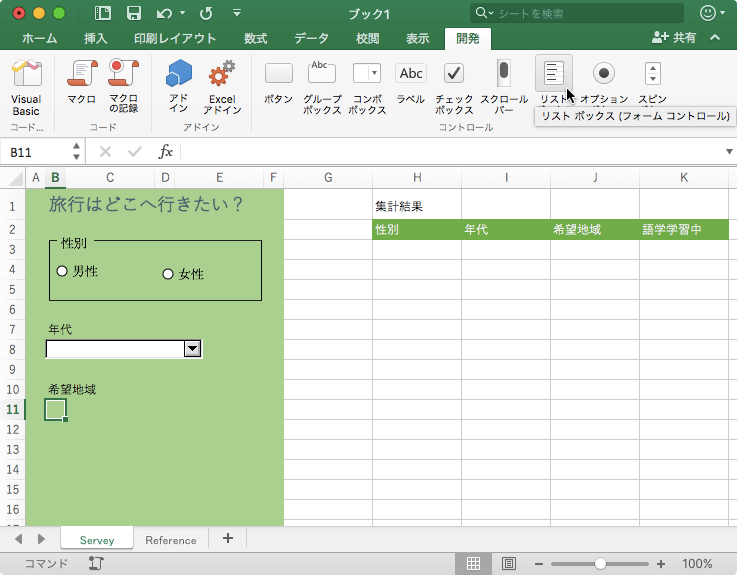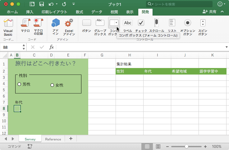 フォームコントロールを使って、ワークシート上にデータを効率よく入力したり表示したりできます。Excel 2016 for Macであらかじめ[開発]タブを表示させたうえで[開発]タブの[コントロール]グループから挿入したいフォームコントロールを選択します。ここでは、コンボボックスとリストボックスを挿入する方法について説明します。