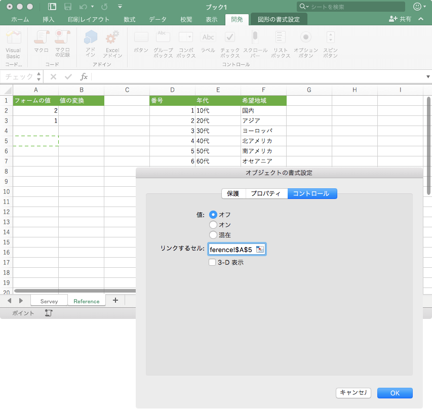 Excel 2016 for Macで対象となるチェックボックスを右クリックしてショートカットメニューより[コントロールの書式設定]を選択し、リスト範囲とリンクするセルを選択します。チェックするとTRUE、チェックを外すとFALSEが返されます。