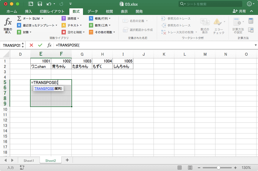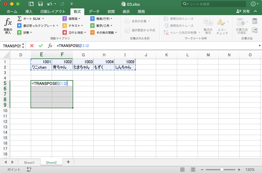 Ctrl+Shift+Enterキーを押すと、行と列が入れ替えられました。