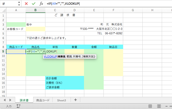 - そのまま「=IF(」と入力し、A9を選択して「="","",VLOOKUP(」と入力します。