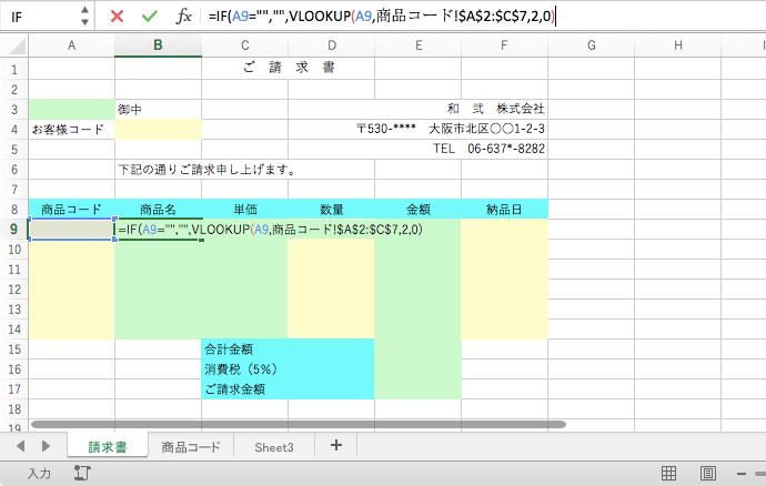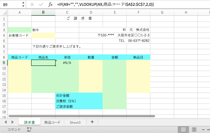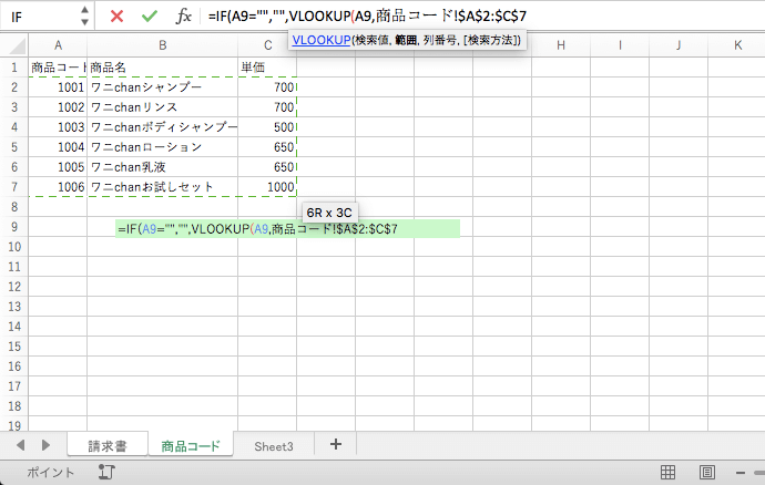 =IF(A9="","",VLOOKUP(A9,商品コード!$A$2:$C$7,2,0))
