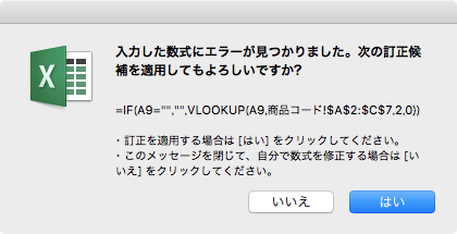 - 括弧が足りない場合は以下のメッセージが表示されます。[はい]ボタンをクリックします。