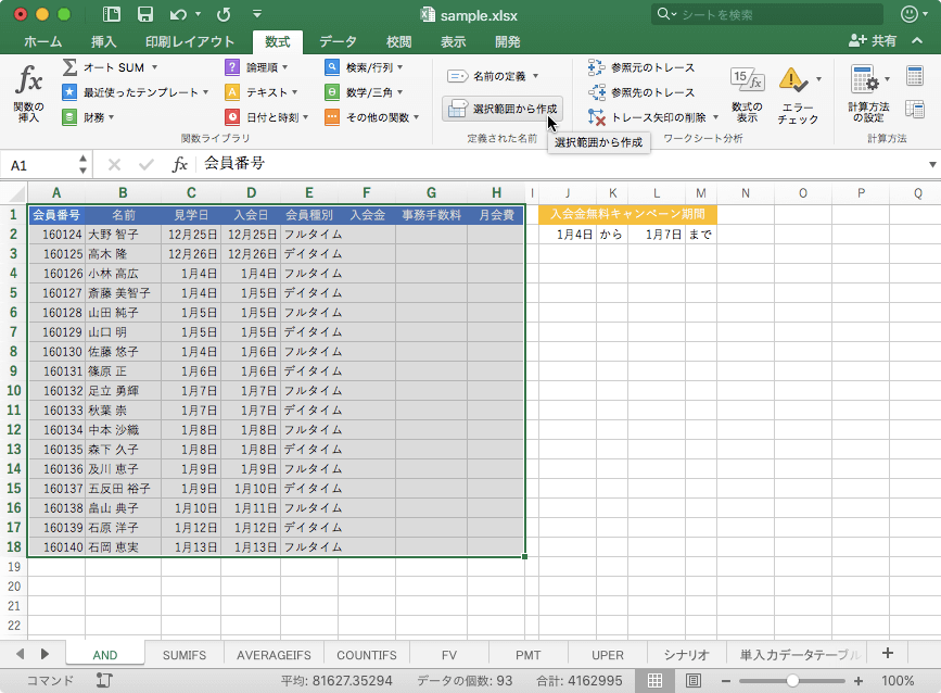 - 見出しとデータ範囲を選択して[数式]タブを開き、[定義された名前]グループの[選択範囲から作成]をクリックします。