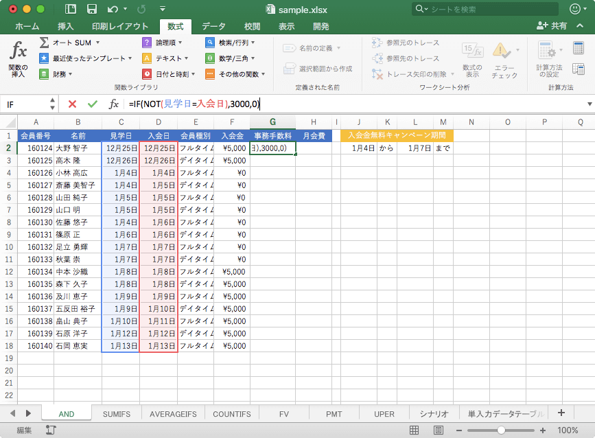 =IF(NOT(見学日=入会日),3000,0)