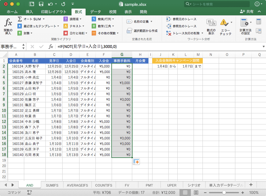 ここでは、見学日と入会日が同日でない場合に事務手数料3000、そうでなければ0を返す方法について説明します。