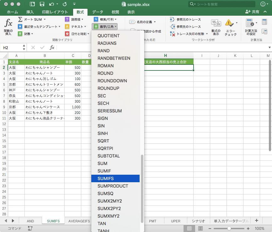 - 合計を求めるセルを選択して、[数式]タブの[数学/三角]から[SUMIFS]を選択します。