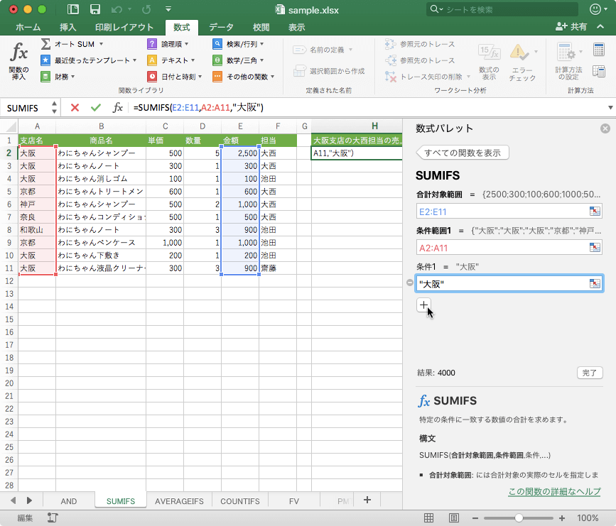 SUMIFS関数は、複数の条件すべて満たす場合に、対応するセル範囲の数値の合計を返します。