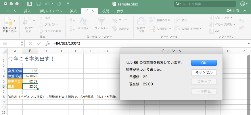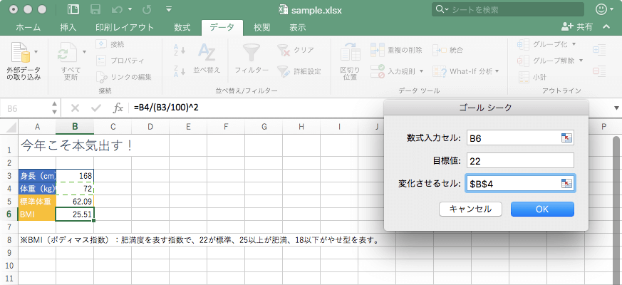 目標値を設定したいセル(ここではBMIの値が入ったセル)を選択して、[データ]タブの[データツール]グループの[What-If分析]をクリックして、[ゴールシーク]を選択します。