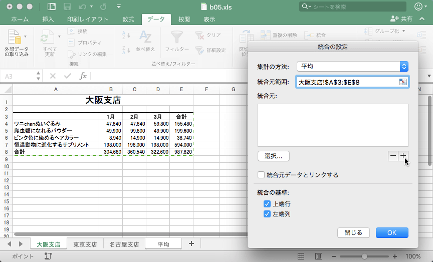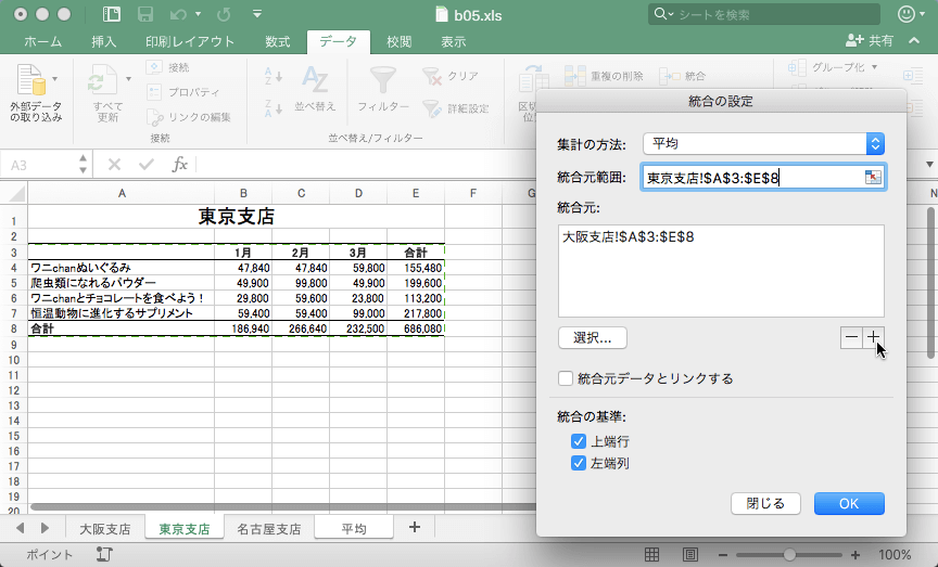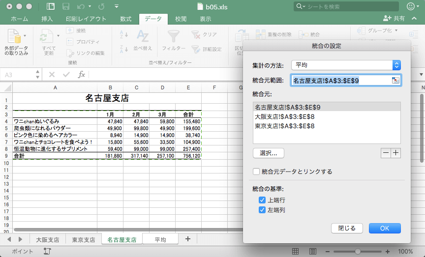 - [統合の設定]ダイアログボックスの[集計の方法]は[平均]を選択します。