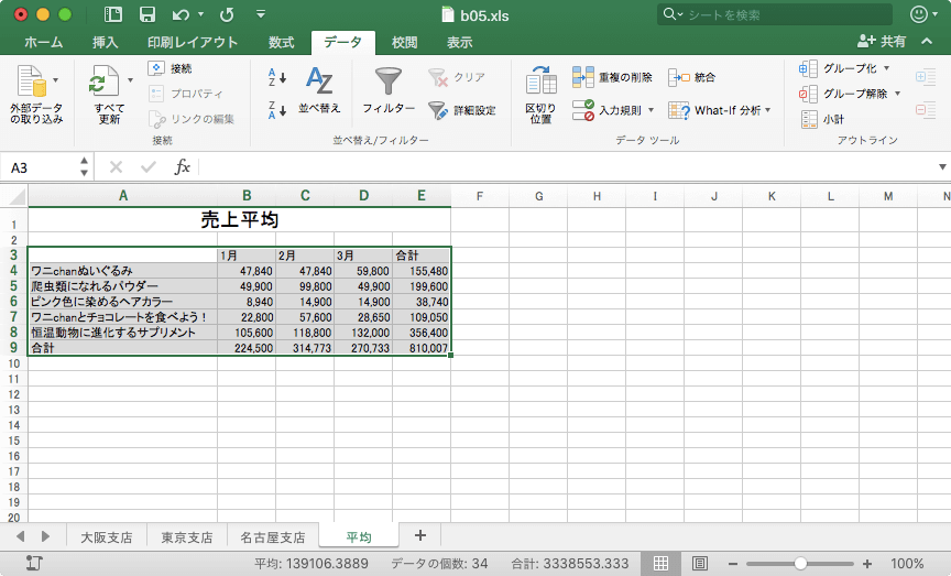 ここでは、項目を基準にしてそれぞれの売上高の平均を求める方法について説明します。