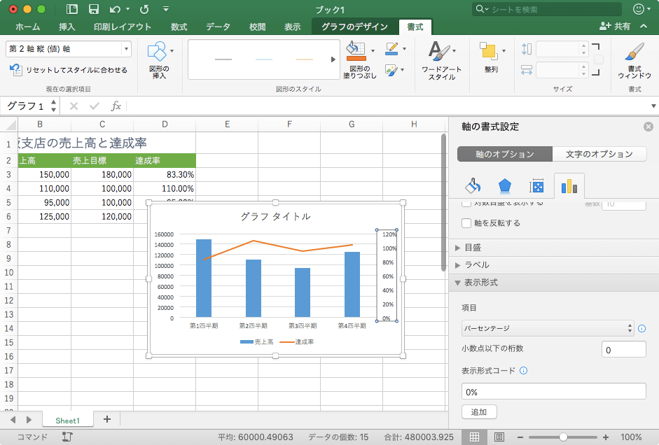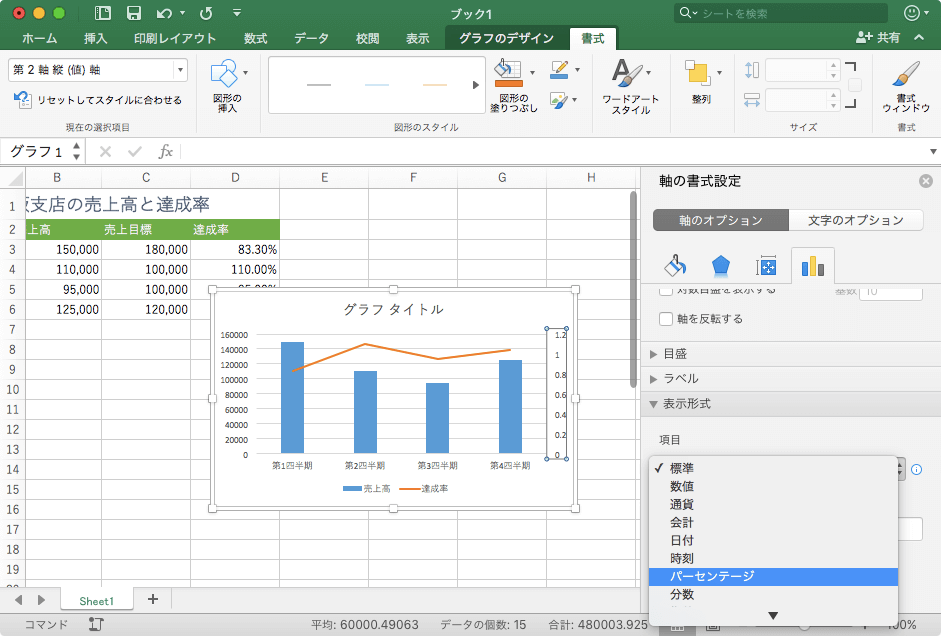 Excel 2016 for Macでおすすめグラフから複合グラフを作成すると、軸の表示形式が標準になり、セルの書式が無視されてしまいます。これを正しく%表示にするには、グラフを選択してから[書式]タブを開き、第2軸を選択してから[書式ウィンドウ]を開き、[表示形式]を[標準]から[パーセンテージ]にします。