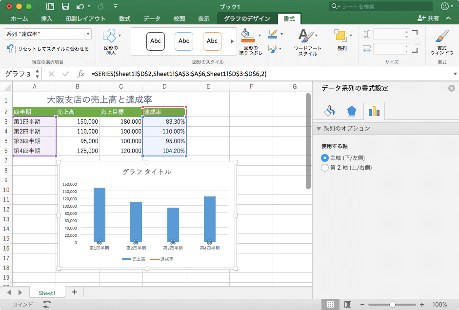 - 折れ線グラフに変更した系列を選択します。確実に選択するには、まずグラフを選択して[書式]タブを開き、[現在の選択範囲]一覧より[系列"達成率"]を選択します。