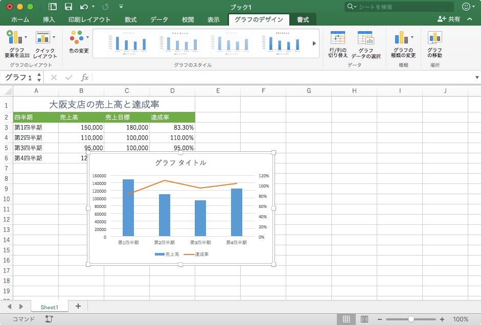 複合グラフ作成時、Excelでは自動的に値の大きい項目を棒グラフに設定されます。Excel 2016 for Macで横軸データを切り替えたい場合は、その複合グラフを選択して[グラフのデザイン]タブの[データ]グループの[行/列の切り替え]をクリックします。