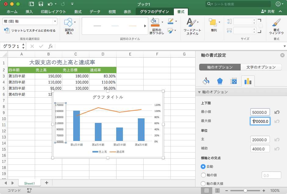グラフの数値軸の最大値や最小値などを変更するには