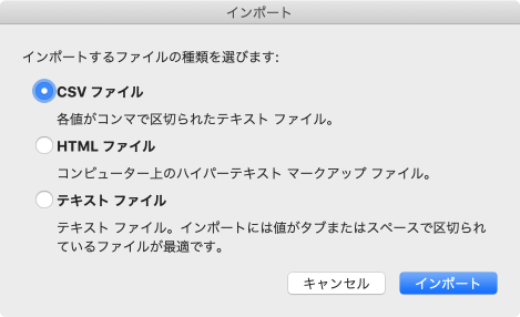 - [インポート]ウィンドウから[CSVファイル]を選択して[インポート]ボタンをクリックします。