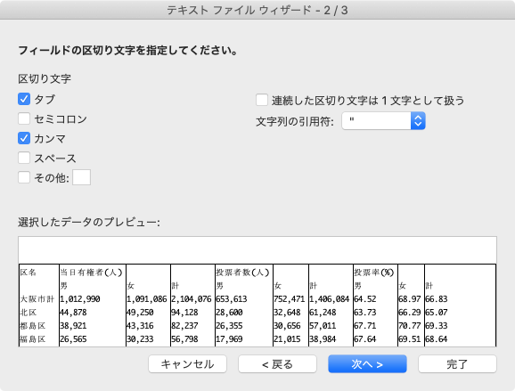 - 列のデータ形式をそれぞれ選択して[完了]ボタンをクリックします。
