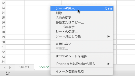 空白のブックを作成した場合、既定のシートの数は1枚です。シートタブの右側の[+]をクリックするか、[挿入]メニューの[シート]をポイントして[シートの挿入]を選択します。ショートカットキーはshift+F11です。