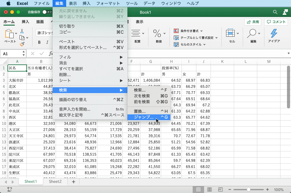 - 該当するワークシートを開き、[編集]メニューの[検索]をポイントして[ジャンプ]を選択します。