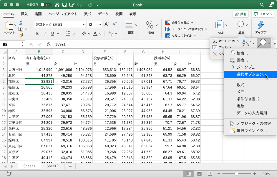 [ホーム]タブの[検索と選択]から[選択オプション]を選択することで、素早く選択オプションにアクセスできます。