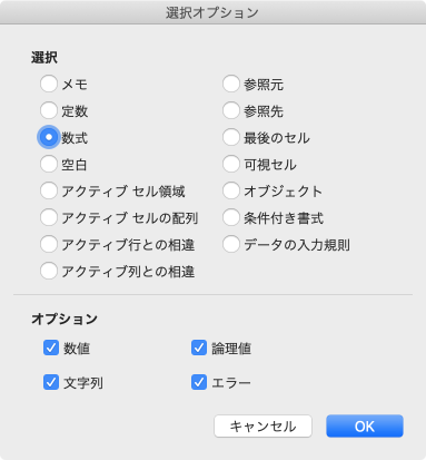 コメント、数式が入ったセル、最後のセル等に移動するには、ジャンプ機能の[セル選択]オプションで一覧から選びます。