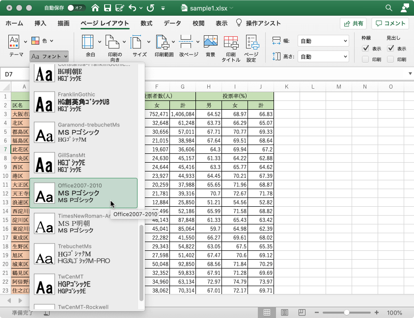 気に入ったテーマを見つけたけど、フォントは違うテーマのものを適用することができます。[ページレイアウト]タブの[テーマ]グループの[テーマのフォント]をクリックして、一覧から異なるテーマのフォントを選択します。游ゴシックではなく従来のフォントにするには、一覧から[Office2007-2010]を選択するとよいでしょう。ただし、Excel for Macの場合はフォントのカスタマイズが行えません。
