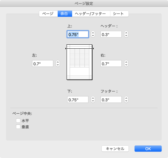 - [ページ設定]ダイアログボックスの[余白]タブが開かれるので、それぞれ指定して[OK]ボタンをクリックします。