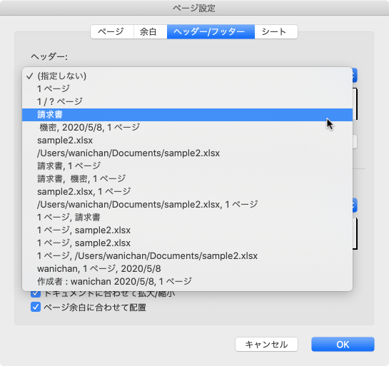[ページ設定]ダイアログで組み込みのヘッダーを挿入する
