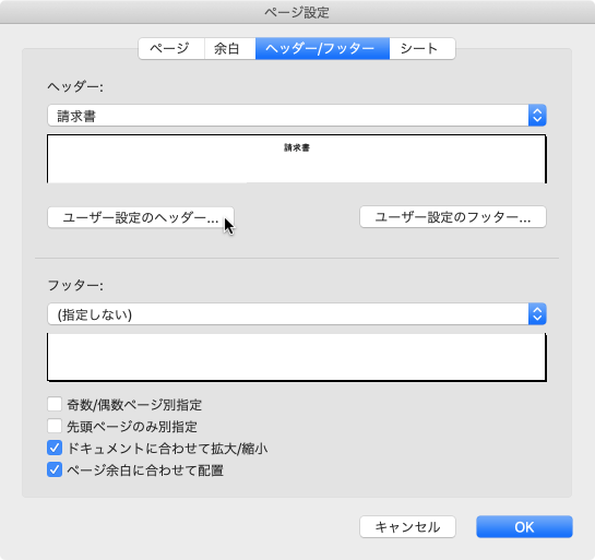 - [ページ設定]ダイアログボックスの[ヘッダー/フッター]タブを開き、[ユーザー設定のヘッダー]ボタンをクリックします。
