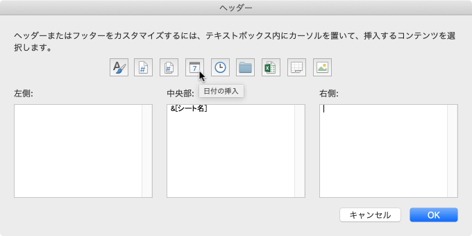 [ページ設定]ダイアログでヘッダーの右側に日付を挿入する