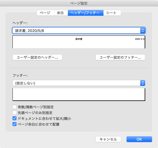 - [ページ設定]ダイアログボックスの[ヘッダー/フッター]タブを開きます。