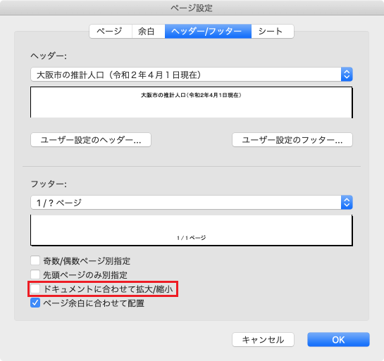 印刷用にワークシートを拡大縮小する場合に、ヘッダーとフッターのフォント サイズが変更されないようにするには、[ページ設定]ダイアログボックスの[ヘッダー/フッター]タブにて、[ドキュメントに合わせて拡大/縮小]のチェックを外すか、ページレイアウトビューに切り替えてヘッダーとフッターを表示し、[ヘッダーとフッター]タブの[オプション]グループの[ドキュメントに合わせて拡大/縮小]のチェックを外します。