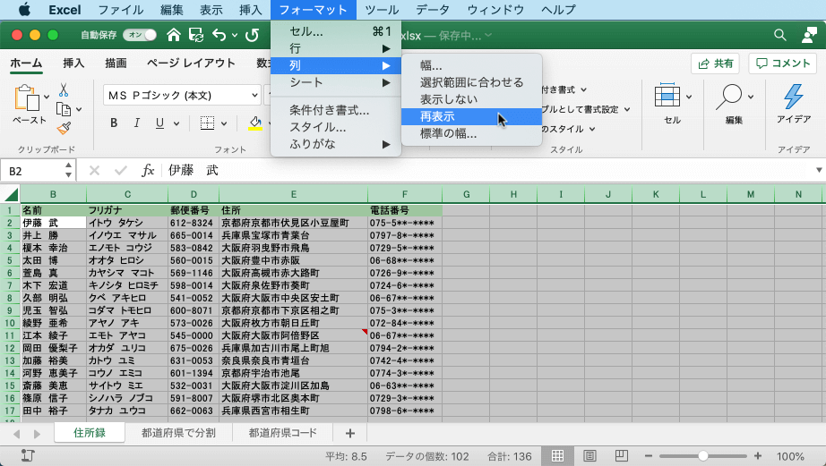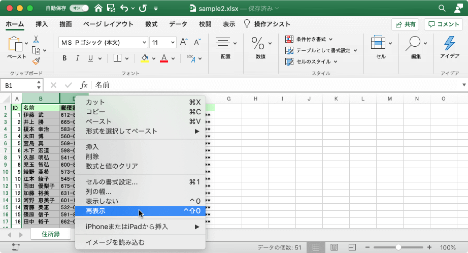 - 前後の列を選択して右クリックし、ショートカットメニューより[再表示]を選択するか、[フォーマット]メニューの[列]一覧より[再表示](shift+control+0)を選択します。