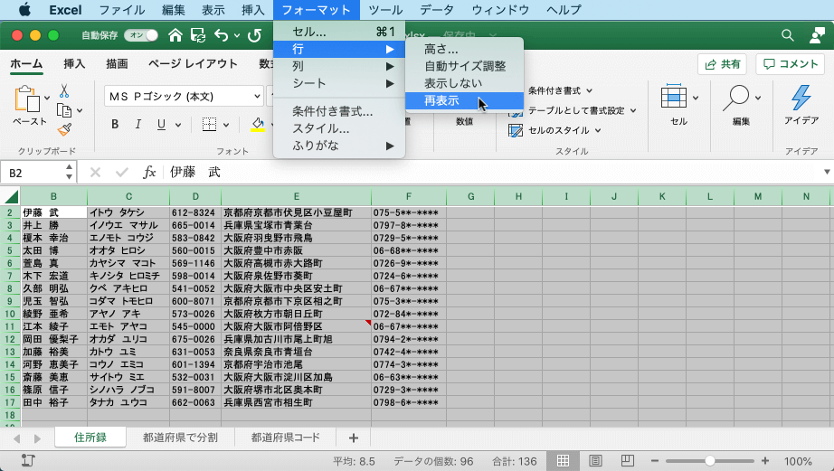 行や列を非表示にするには